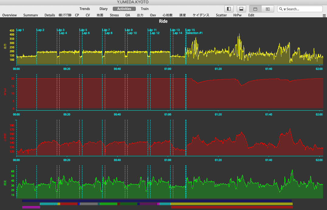 ワークアウト中は2段目のW'Balanceが動いていない。何故??心拍数は上下しているから、疲労度の上下はあるはずなのに。振れ幅が少ないからか?それでも2時間でTSS126はいい数字だ。