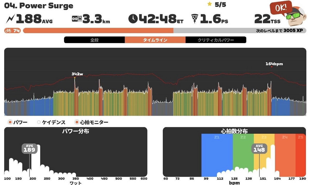 (210w/90rpm×3分+245w/100rpm×30秒)×4本を2セット。
