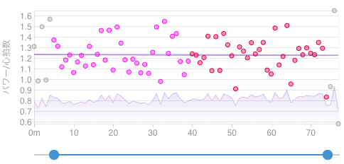 w/HRは初めて水平線となった。Bernie →Coco →Jacquesさんを平均化して走ったので短時間で疲れてしまったのかもしれない。 本当は前後に10分ずつくらいアップとダウンを入れれば体調管理にもいいのだろうな。