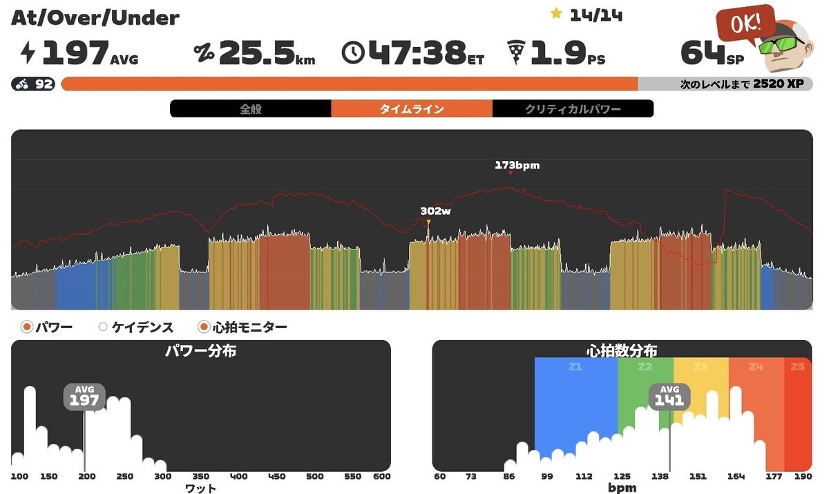 3本目の255wは指定ケイデンス95に対し最低で59まで落ちてヘトヘトボロボロ。ウォームアップの10分であまり調子良くないなと思ったが、やっぱり苦しかった。でもやり遂げた。
