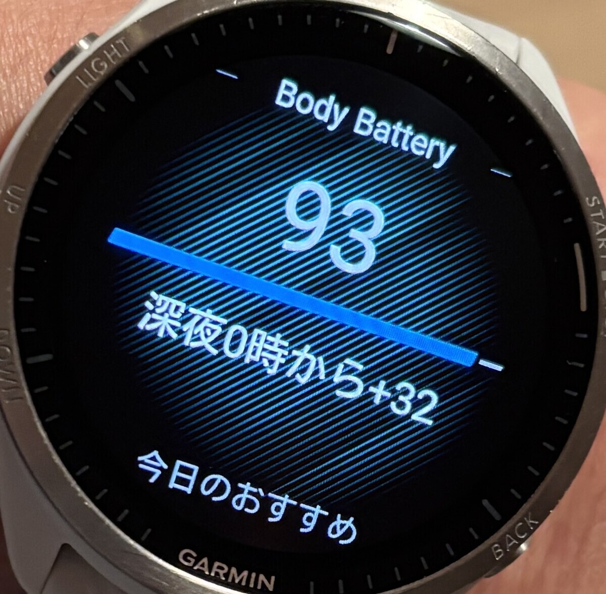 昨晩のHRVステータスが体感よりも良く、夜間ストレスも低くボディバッテリーも満タンに近い。こちらを信じて予定通り外朝練決行。いつもの軽朝食にバナナを1本足して、時間を惜しんで体操、体幹トレ無しで出発。