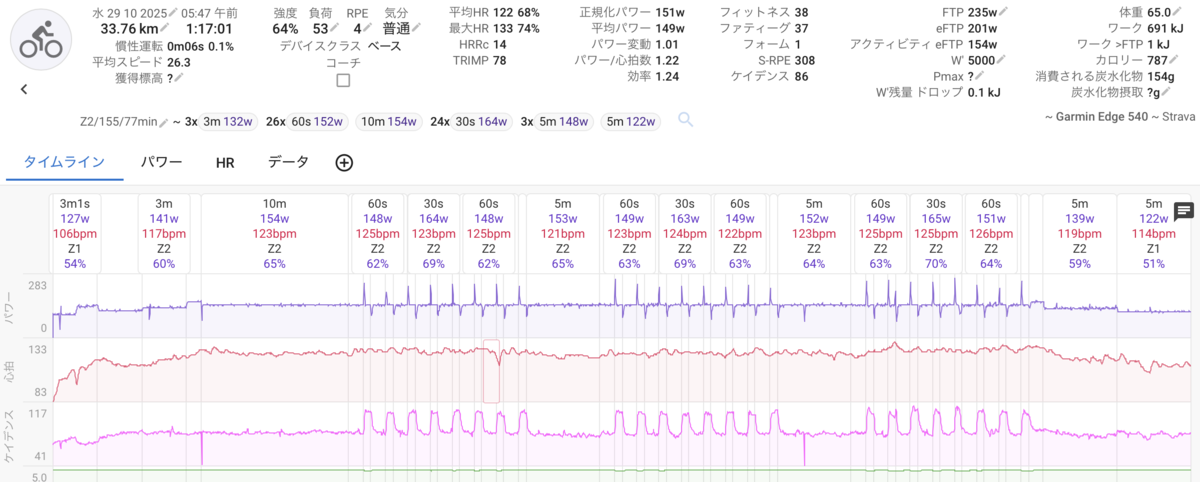 プチ体幹トレで腰回りを温めトレーニングスタート。今日はスタート直後のウォームアップステップのところで150w台の山ができてしまった。やり出した頃に???となったことがあって、理由が当初分からなかったが、ZWIFTを先に開始すると、レジスタンスを切っていてもZWIFT側に出力が引っ張られるようで、先にEDGE540のワークアウトをスタートさせないといけないということが判明。