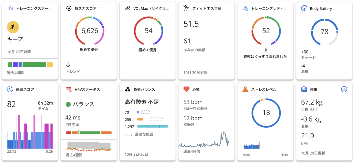 睡眠スコア82で良いの判定、かつHRVステータスは42でギリギリベースライン上に戻った。とはいえ、ベースライン自体がジリジリ下がっているため価値は低い。昨日はビールノーマル缶1本に赤ワイン少々飲み過ぎだったが、夜間平均ストレス18と低く出た。今日は在宅勤務で結構遅くまで(というか完全に寝坊状態)寝れたのは良かったが、寝起きが悪過ぎて各スコアが良好なのが癪にさわる。