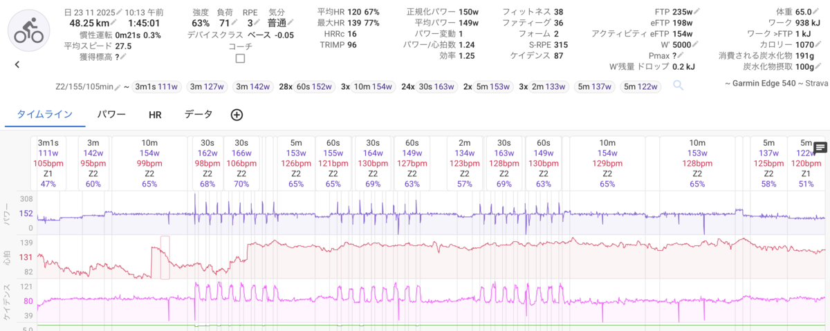 呉春飲み過ぎて心拍数の上振れは顕著。でもMax139bpmならギリ合格ラインだ。心拍Z2に入ったけど、FatMax trainingとしてはほぼやり切れた感触。